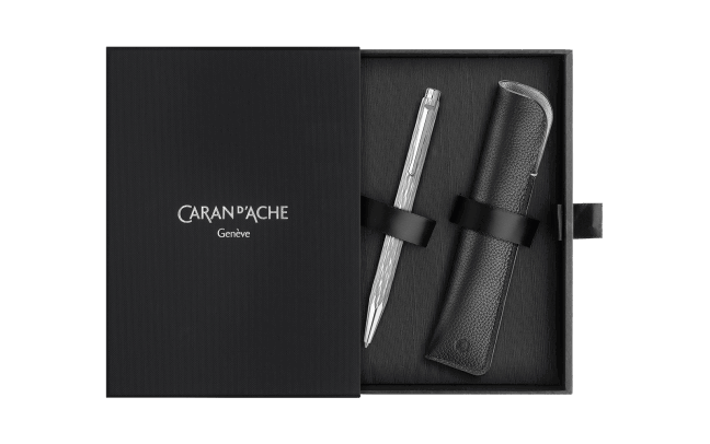 Hexagonal brass body with a platinum finish Engraving technique with a hammered effect sculpted into the material Caran d??Ache logo laser-engraved on the push button Platinum push button and flexible clip