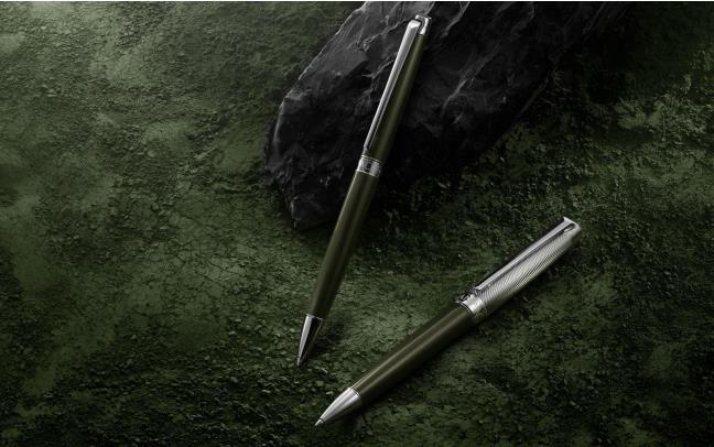 Rhodium and silver coated clip and push button Button carrying the Caran d??Ache identification (khaki green lacquered hexagon)